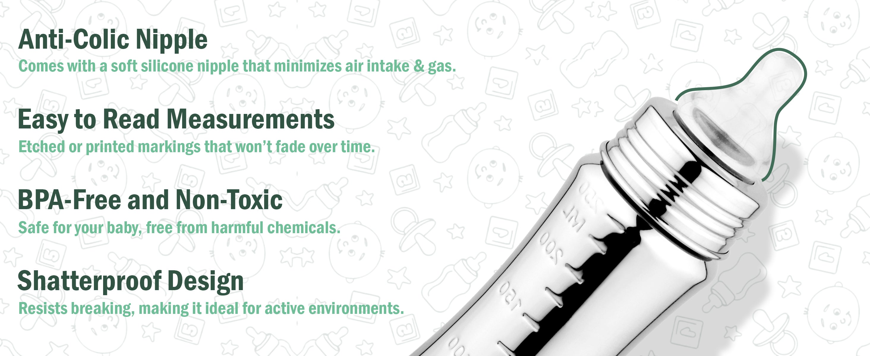 - LEAK-PROOF : Our bottle features a secure and leak-proof design, preventing messy spills and making it suitable for both at-home and on-the-go use. Ergonomic Shape: The bottle's ergonomic shape is easy for both parents and babies to hold, promoting self-feeding as your infant grows.